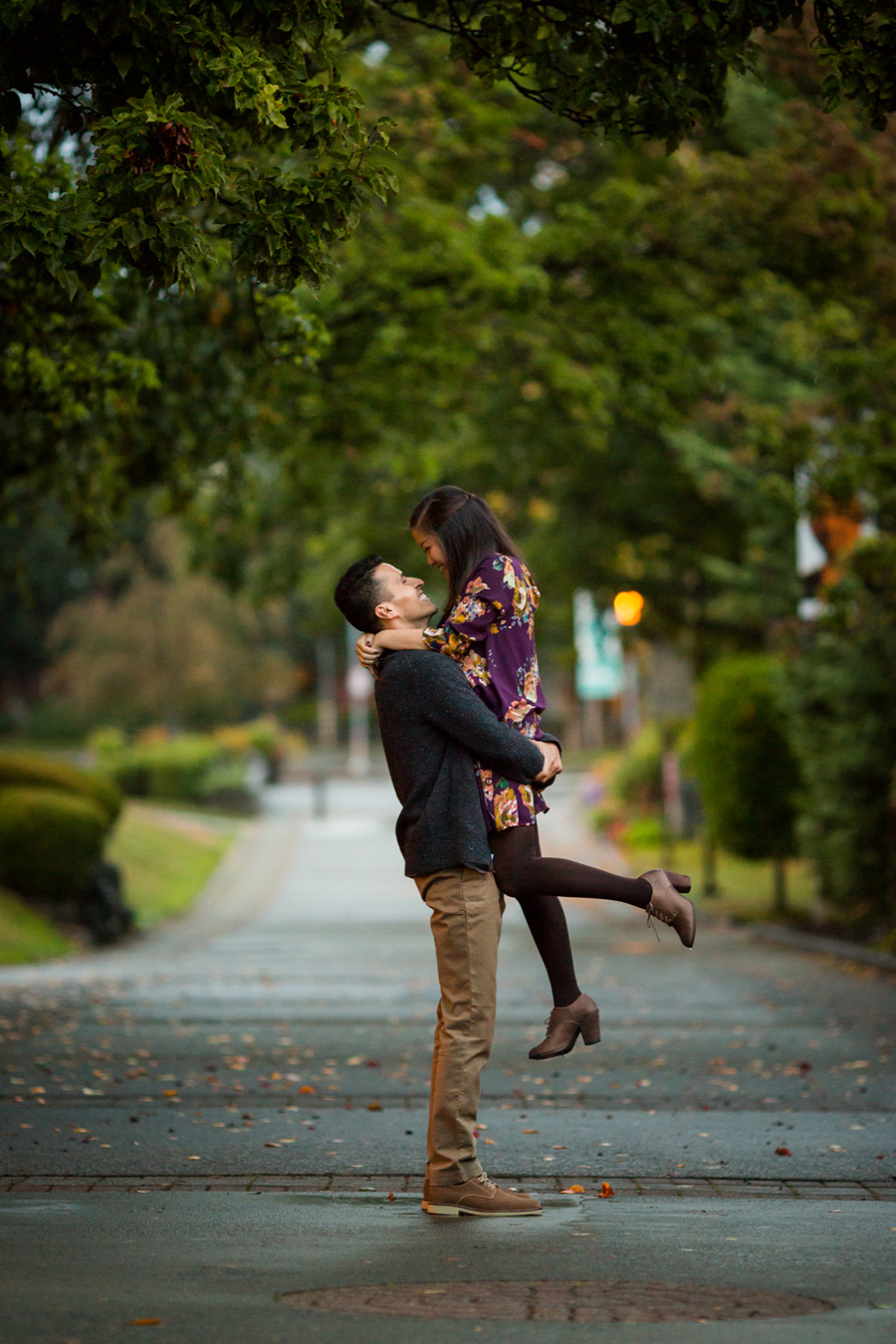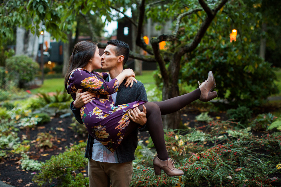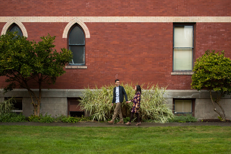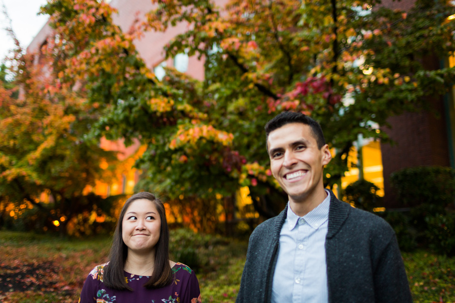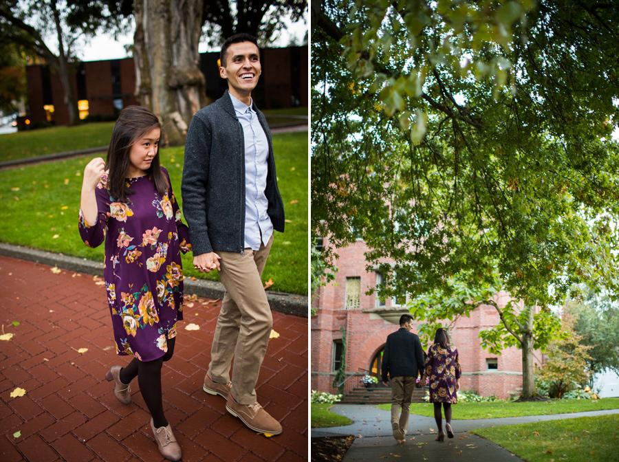 What a fun shoot with Daniel and Kelley! A little about the couple: Daniel noticed a pretty girl that came to help once a week at the elementary school he worked at. He was too nervous to talk to her and get her name because he didn’t want to screw up his chances. Eventually she added him on Facebook and he freaked! He wondered what it meant, did she like him? Was she just adding him as a friend?? What is life? He got up the courage to contact her and asked her to get a Potbelly sandwich and she agreed. A couple years later, he popped the question and they were on their way to marriage! Kelly once told Daniel, “Thank you for choosing to love me.” He told us he really liked that and he’d never heard it said like that. He said, “Wow, I guess it is amazing that i’ve found someone in this world who, at the end of the day, no matter how difficult I’ve been, will still choose to love me.” What a great Fall engagement shoot around Seattle. Starting down at the Seattle Waterfront, we drove to Discovery Park and it was POURING rain.. so we headed over to Seattle Pacific University to seek shelter and found some fantastic light and fun backdrops 🙂