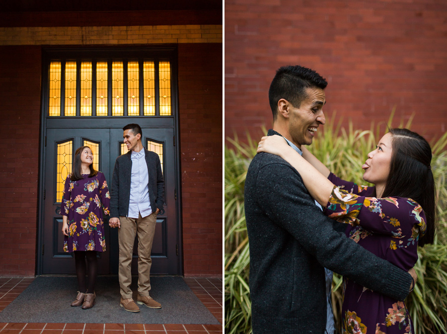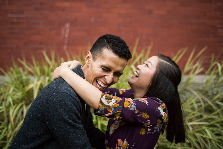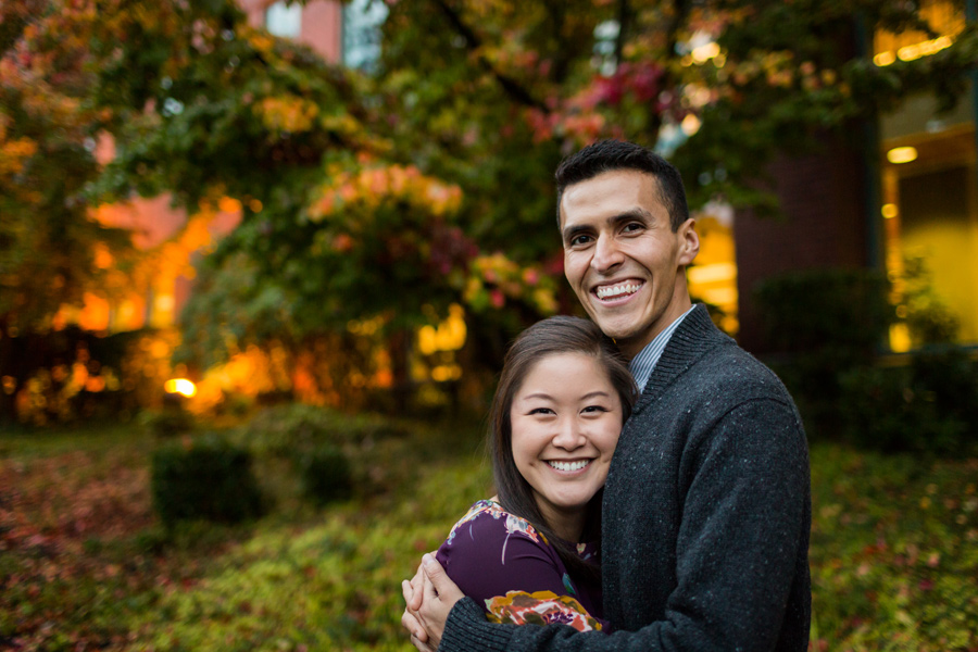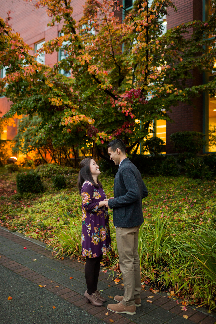 What a fun shoot with Daniel and Kelley! A little about the couple: Daniel noticed a pretty girl that came to help once a week at the elementary school he worked at. He was too nervous to talk to her and get her name because he didn’t want to screw up his chances. Eventually she added him on Facebook and he freaked! He wondered what it meant, did she like him? Was she just adding him as a friend?? What is life? He got up the courage to contact her and asked her to get a Potbelly sandwich and she agreed. A couple years later, he popped the question and they were on their way to marriage! Kelly once told Daniel, “Thank you for choosing to love me.” He told us he really liked that and he’d never heard it said like that. He said, “Wow, I guess it is amazing that i’ve found someone in this world who, at the end of the day, no matter how difficult I’ve been, will still choose to love me.” What a great Fall engagement shoot around Seattle. Starting down at the Seattle Waterfront, we drove to Discovery Park and it was POURING rain.. so we headed over to Seattle Pacific University to seek shelter and found some fantastic light and fun backdrops 🙂