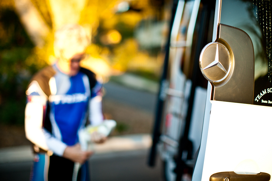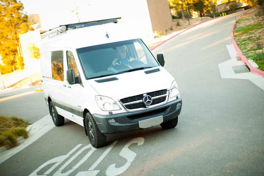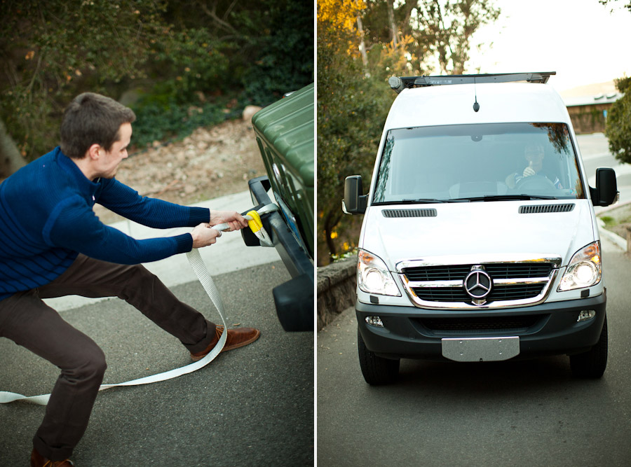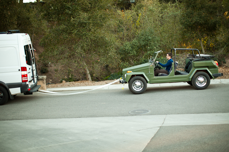 Dad (fresh from a bike ride) appears with his Mercedes Sprinter. We then proceed to tow the Thing to see if we give it some serious momentum while popping the clutch in 2nd gear.
