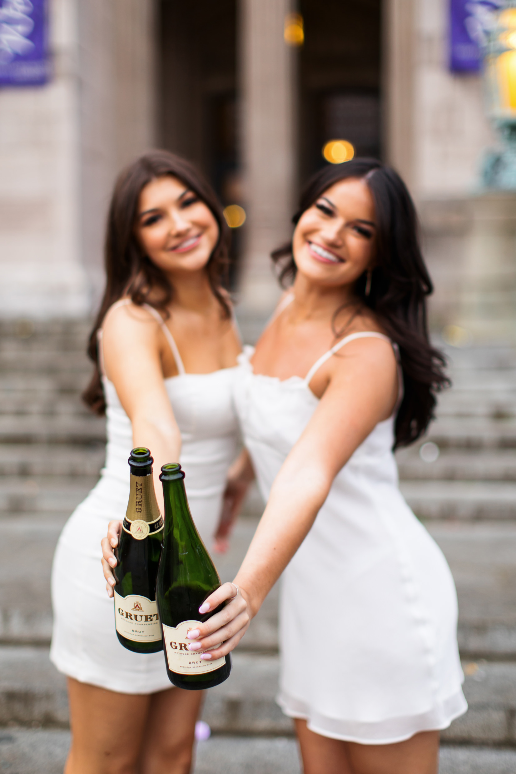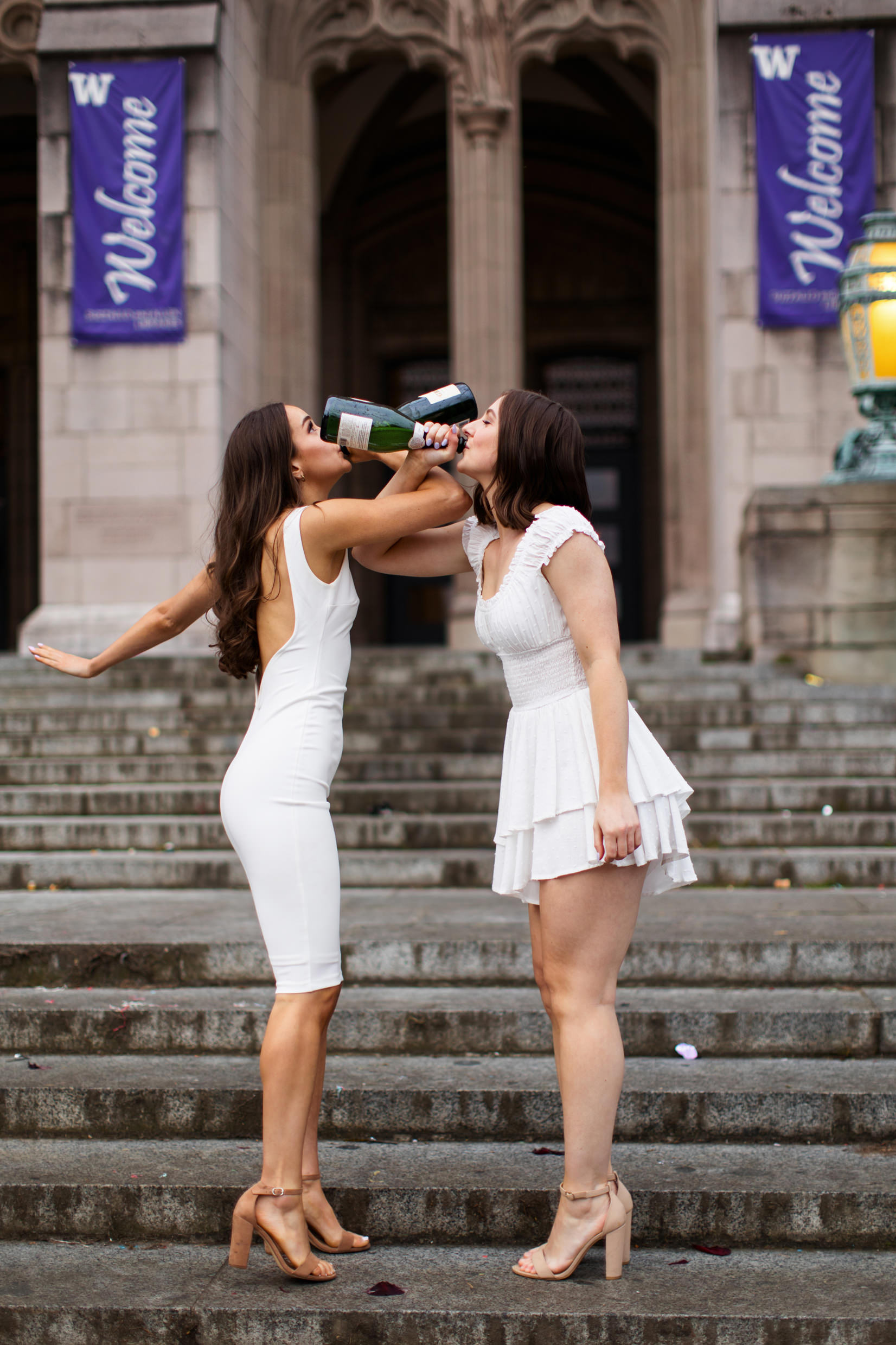 These gals found me on Google after searching “UW Senior Photos” and booked me to take photos of them celebrating their 2022 graduation! A lot of graduating seniors want to take photos at various locations around the University of Washington campus; locations such as Red Square, the Quad, Suzzallo Library Steps, the fountain, on and on. These gals decided to bring some champagne along for the adventure–what a fun time!